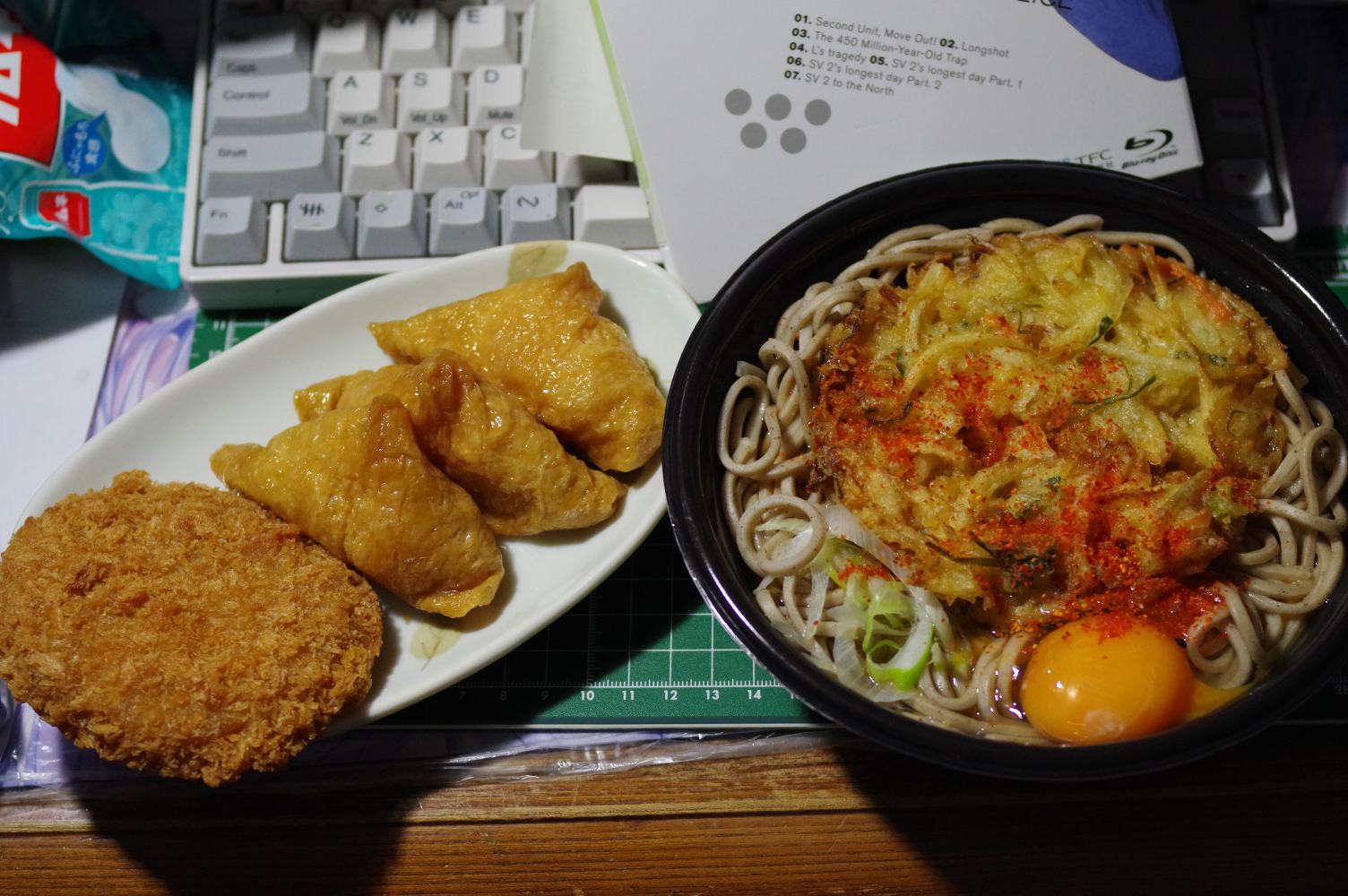 夕食。入院中に放映していた「二課の長い一日」に合わせて食べようと思っていた蕎麦+コロッケ+卵+おいなりさん。